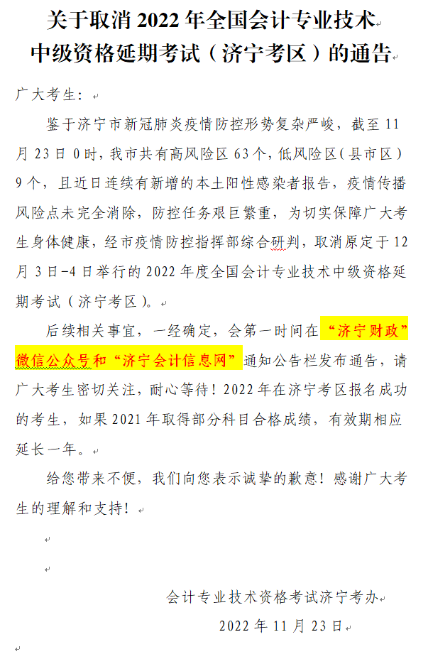 【中级会计延期考试取消】关于取消2022年全国会计专业技术中级资格延期考试(济宁考区)的通告