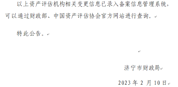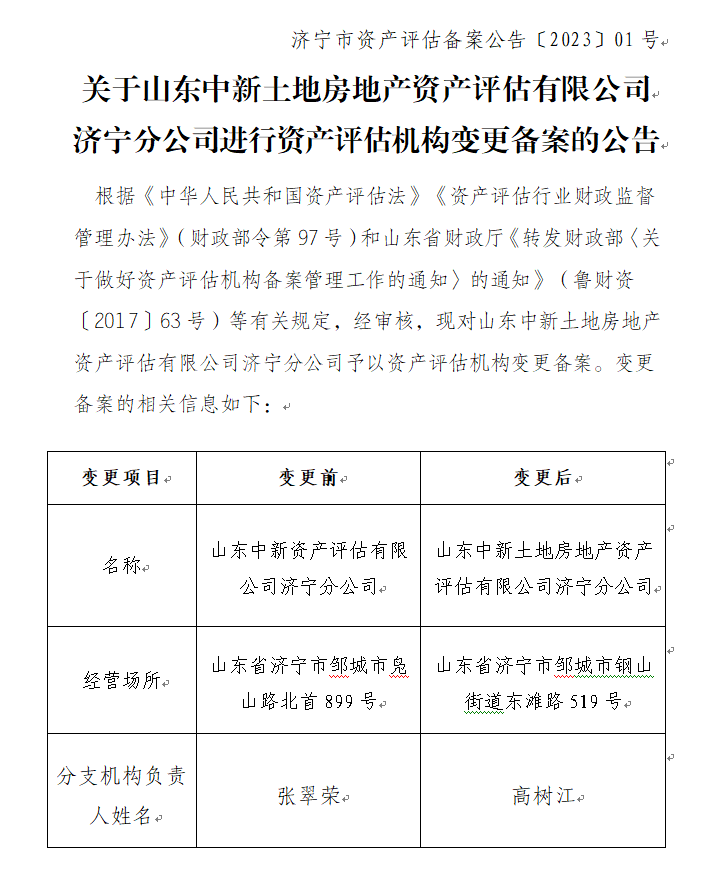 关于山东中新土地房地产资产评估有限公司济宁分公司进行资产评估机构变更备案的公告