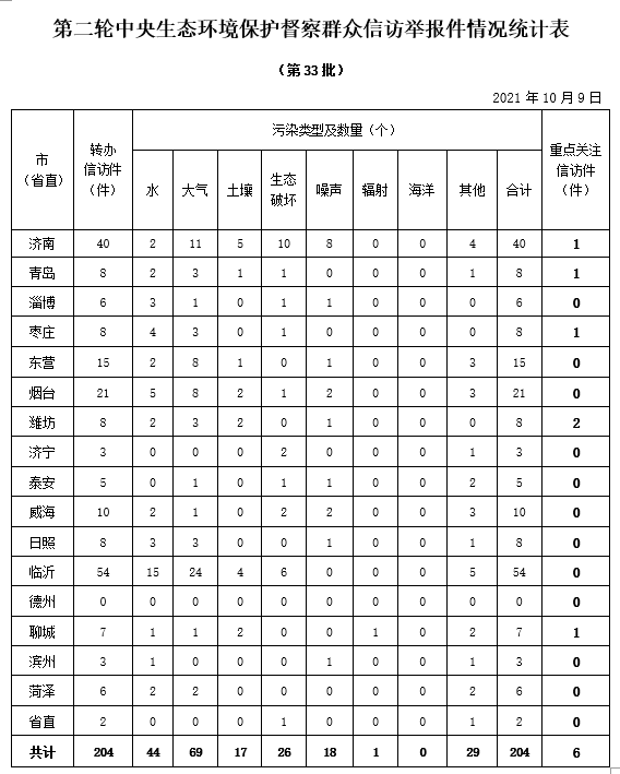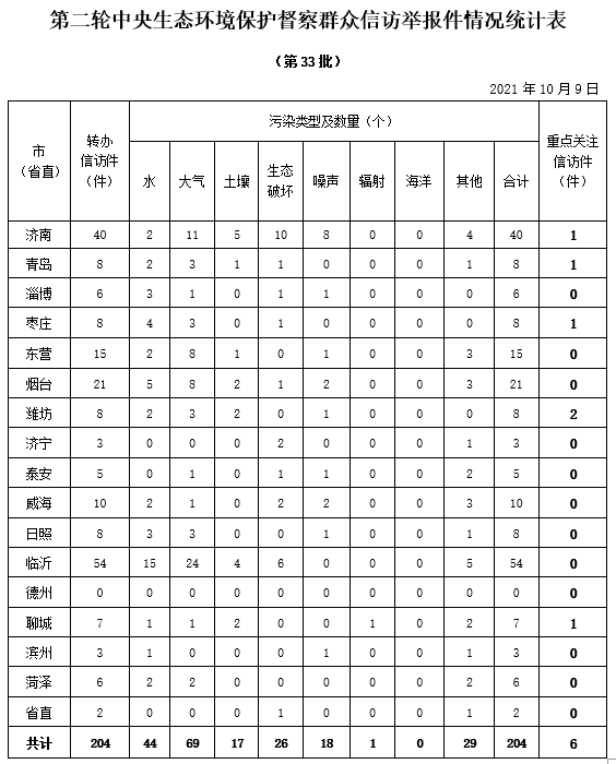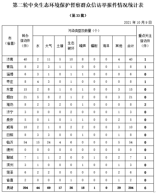 小]10月9日,中央第二生态环境保护督察组向我省转办信访件204件(重点关注件6件)。本批信访件涉及济南市40件、青岛市8件、淄博市6件、枣庄市8件、东营市15件、烟台市21件、潍坊市8件、济宁市3件、泰安市5件、威海市10件、日照市8件、临沂市54件、聊城市7件、滨州市3件、菏泽市6件、省直部门2件。共涉及环境问题204个,其中大气污染问题69个、水污染问题44个、土壤污染问题17个、生态破坏问题26个、噪声污染问题18个、辐射污染问题1个、其他问题29个。当日,上述信访件全部交办各市和省直部门。按照中央第二生态环境保护督察组的要求,信访举报件的办理情况须在10天内反馈到督察组,整改和处理情况将及时向社会公开。