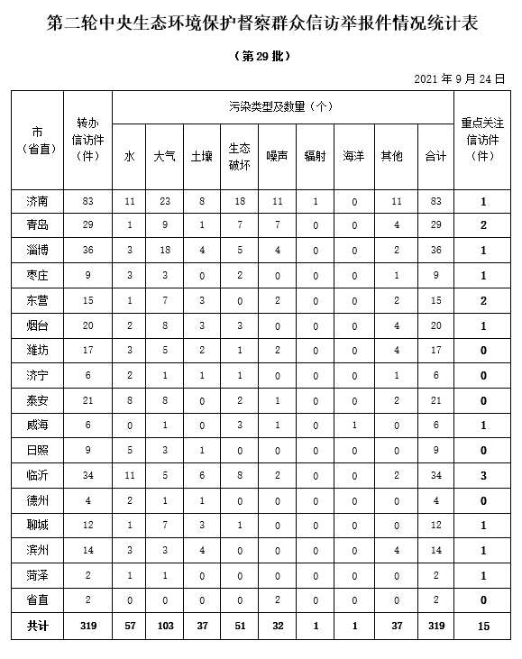 9月24日,中央第二生态环境保护督察组向我省转办信访件319件(重点关注件15件),其中来电75件,来信244件。本批信访件涉及济南市83件、青岛市29件、淄博市36件、枣庄市9件、东营市15件、烟台市20件、潍坊市17件、济宁市6件、泰安市21件、威海市6件、日照市9件、临沂市34件、德州市4件、聊城市12件、滨州市14件、菏泽市2件、省直部门2件。当日,上述信访件全部交办各市和省直部门。按照中央第二生态环境保护督察组的要求,信访举报件的办理情况须在10天内反馈到督察组,整改和处理情况将及时向社会公开。